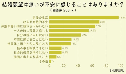 結婚願望は無いが不安に感じることを尋ねたところ、1位は「老後の生活(48.5%)」、2位「収入や金銭的不安(35%)」となりました。結婚せずに子どもも居ないとなると老後一人になってしまう可能性が高まります。また2位の「収入や金銭的な不安」も併せて、独身での生活に対して将来への不安を感じている方は多いようです。