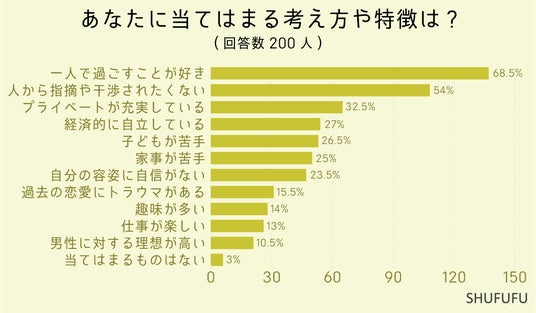 あなたに当てはまる考え方や特徴は?の問いに対して最も多かったのが「一人で過ごすことが好き(68.5%)」でした。 次いで「人から指摘や干渉されたくない(54%)」「プライベートが充実している(32.5%)」という結果でした。結婚すると一般的には配偶者と同居し生活することになるので、一人で過ごすことが好きな人には苦痛が伴うのかもしれませんね。