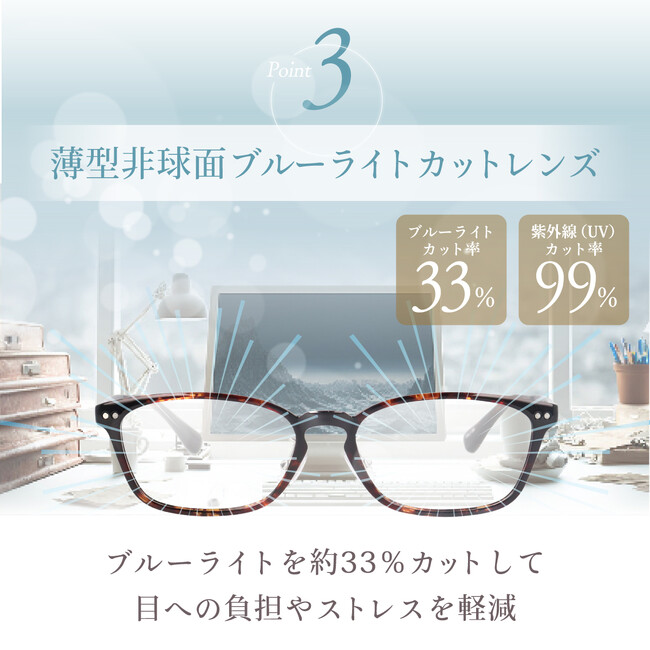 3. 薄型非球面ブルーライトカットレンズ – 安心安全な国内レンズを採用し、薄型でありながら視界はクリア。デジタルデバイスからのブルーライトを効果的にカットし、目の疲れを軽減します。
