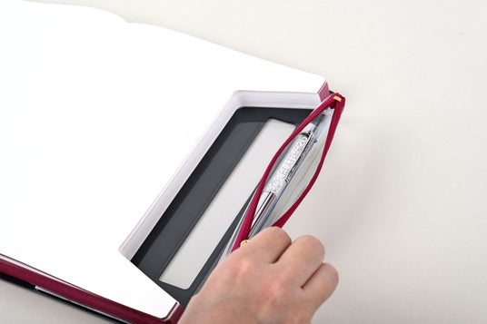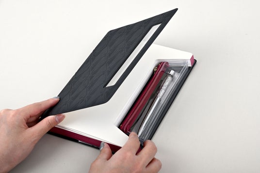 既存製品ではペンを側面に差し込むもの、ペンホルダーを装着させるものなど、ノートからはみ出てしまうものが多い。そこで、表紙の内側にポシェットを格納することで、スマートなデザインを目指した。