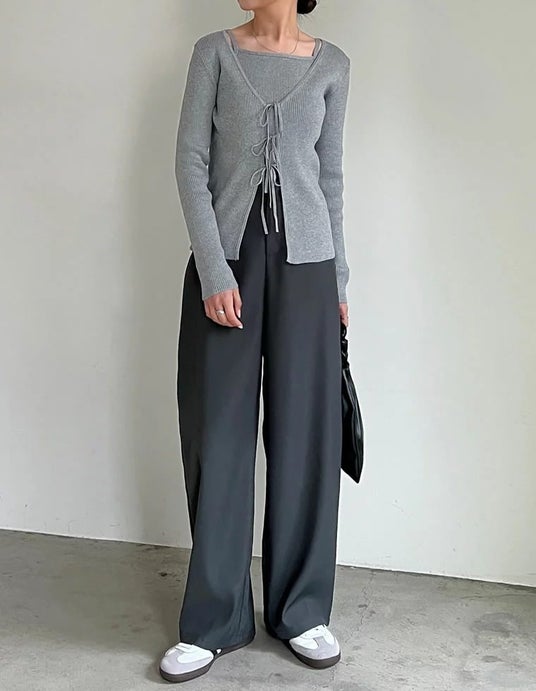 トレンドのグレーとチャコールグレーのグラデーションコーデはシンプルなのに洒落感たっぷり。 すぐに移動ができるように、パンツスタイルが何かと楽ちんです。