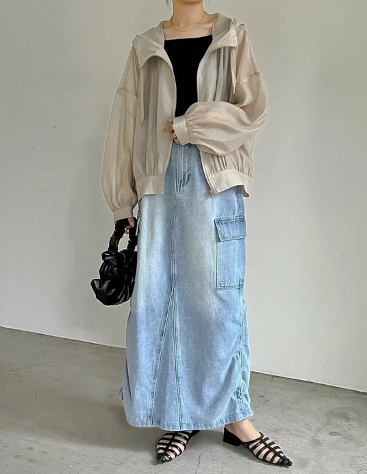 日よけしながらも涼しく着用できるライトアウター。 例えばデニムなどのカジュアルアイテムとも相性抜群。