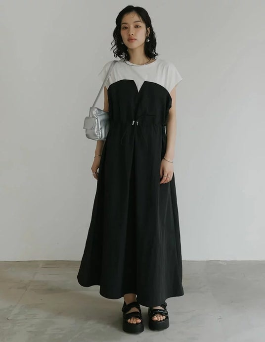 商品名:フレンチスリーブカットソー切り替えドロストフレアドッキングワンピース