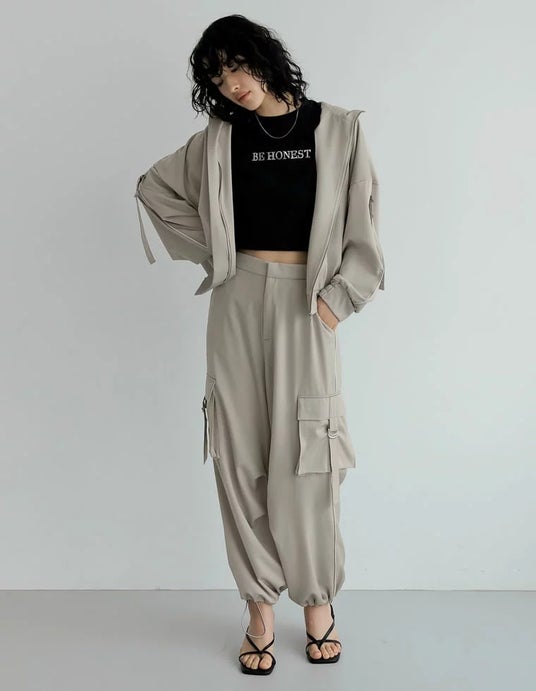 サテン生地で上品見えする、ブルゾンセットアップ。 朝の冷え込みや、お昼の日差しが強いタイミングは羽織りアイテムも必須に。