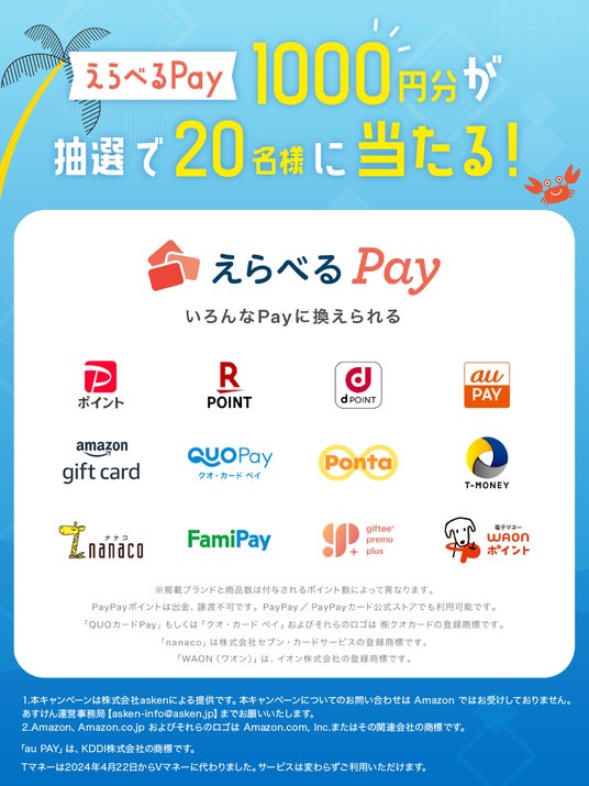 累計会員数1000万人超・国内No.1*¹AI食事管理アプリ『あすけん』の開発・運営を行う株式会社asken(東京都新宿区、代表取締役社長 中島洋、以下「当社」)は、このたび、あすけん公式X(エックス)をフォローし、「#夏までダイエットにあすけん」のハッシュタグを記載した投稿をすると、抽選で「えらべるPay」が当たるキャンペーンを5月7日(火)~5月21日(火)に開催いたします。