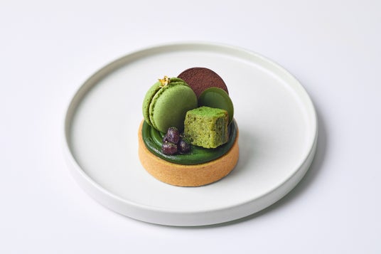サクサクのタルトに、コク深い黒糖のムースと濃厚な抹茶の生チョコを重ね、トップには抹茶のマカロン、抹茶のガトーショコラをあしらいました。さまざまな食感と味わいで贅沢に抹茶をお楽しみいただけます。