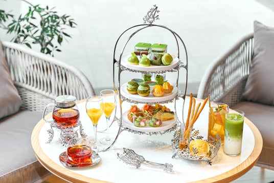 1段目と2段目には、抹茶を贅沢に使用したティラミスやマカロン、ムース、アニヴェルセルで大好評のクレームブリュレやフィナンシェなど、様々な抹茶の味わいをお楽しみいただけます。3段目にはクロワッサンサンドや生ハムとキウイ、モッツァレラのピンチョスなどの色鮮やかなセイボリーをご用意いたしました。