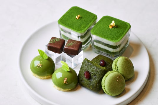 1段目:抹茶のティラミス、抹茶のチョコレート、抹茶のフィナンシェ(小豆)、抹茶のムース、抹茶のマカロン(黒糖バタークリーム)