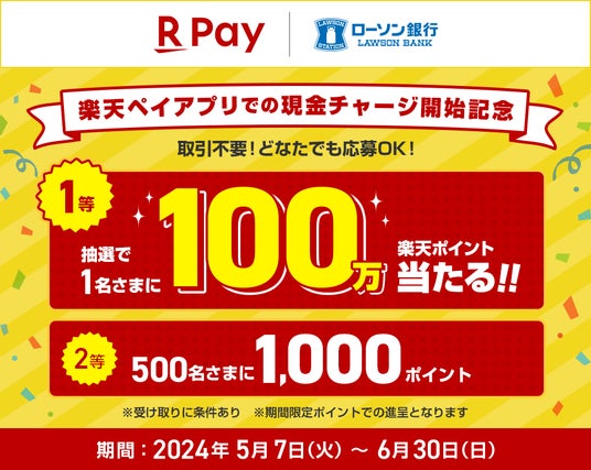 楽天ペイメント株式会社(以下「楽天ペイメント」)と株式会社ローソン銀行(以下「ローソン銀行」)は、ローソン銀行ATMからキャッシュレス決済サービス「楽天ペイ」アプリを通じてオンライン電子マネー「楽天キャッシュ」への現金チャージが可能になったことを記念して、「楽天ペイアプリでの現金チャージ開始記念!最大100万楽天ポイント当たるキャンペーン」を、2024年5月7日(火)から6月30日(日)まで実施いたします。