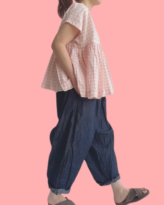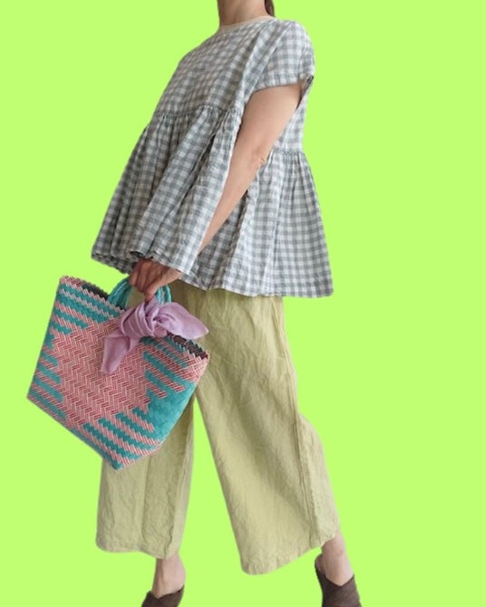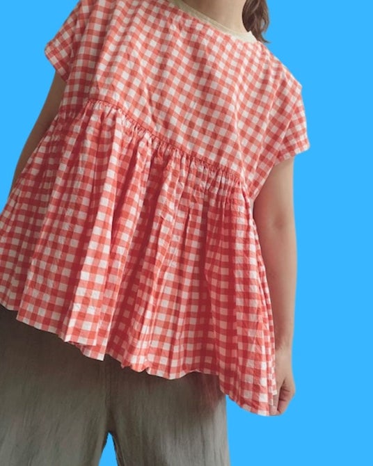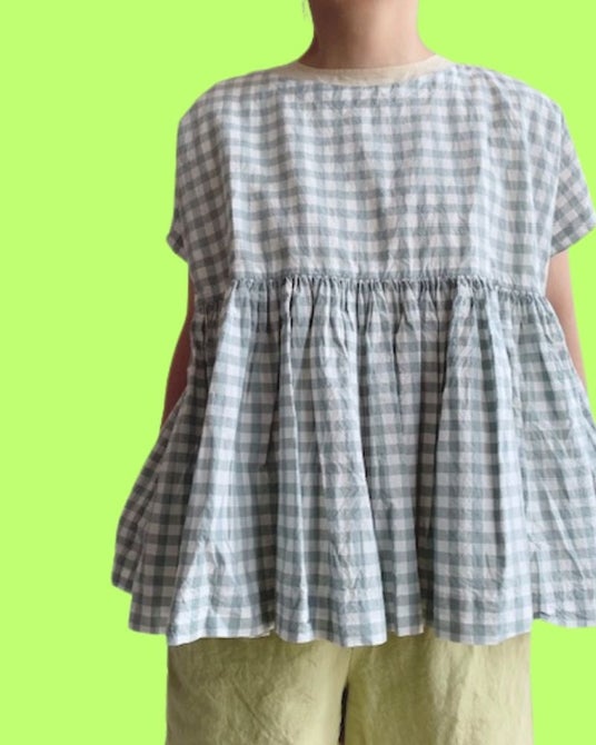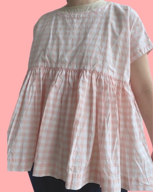 優しい色合いのギンガムチェック生地を使用したトップス。