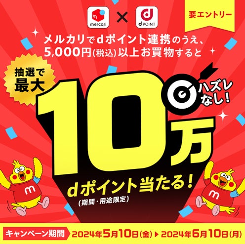 株式会社NTTドコモ(以下、ドコモ)は、キャンペーン期間中にキャンペーンサイトよりエントリーのうえ、メルカリとdポイント連携して5,000円(税込)以上のお買物をすると、抽選でdポイントが最大10万ポイントもらえる「ハズレなし!メルカリで抽選最大10万ポイントもらえるキャンペーン」(以下、本キャンペーン)を2024年5月10日(金)から2024年6月10日(月)までの期間で開催いたします。
