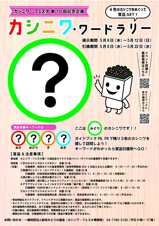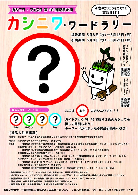– 【第10回記念】カシニワ・ワードラリーの実施カシニワ・フェスタ期間中に各カシニワに4種類の文字を1文字ずつ掲示します。フェスタ来場者には、各カシニワの文字を見つけ、4文字のキーワードを完成させていただきます。商品引換所にキーワードを記入した参加用紙を持参すると、参加賞と特別賞(先着順)と引換ができます。(引換期間は5月8日(水)から5月22日(水)まで)