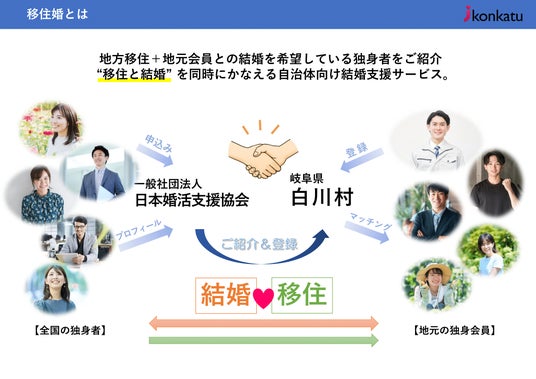 一般社団法人日本婚活支援協会(所在地:東京都港区、代表理事:後藤 幸喜)は、移住先と結婚相手を同時に紹介する「移住婚」の提携先(受け入れ自治体)として、令和6年5月より岐阜県白川村の受け入れが開始したことをお知らせします。
