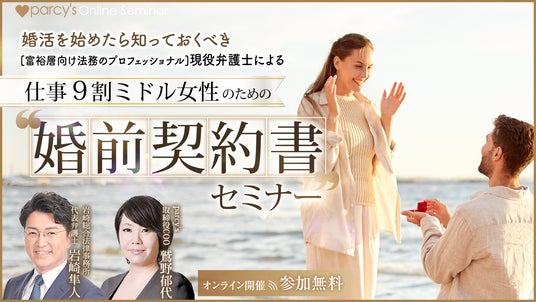恋愛結婚のパーソナルトレーニング「parcy’s」(以下、パーシーズ)を提供する株式会社イグアス(本社:長崎県長崎市、代表取締役CEO:中村 あきら)は、富裕層向け法務のプロフェッショナルである岩崎総合法律事務所・岩崎隼人代表弁護士をお呼びして、「婚活を始めたら知っておくべき仕事9割ミドル女性のための婚前契約書セミナー」(参加無料)を2024年5月25日(土)、5月26日(日)にオンラインにて開催いたします。