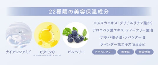 毛穴ケア成分、肌荒れ防止成分などをはじめとした美容保湿成分をたっぷりと配合。