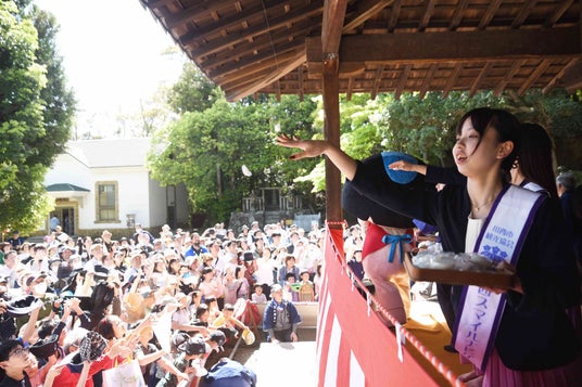 5 月5日の「こどもの日」に、兵庫県川西市の飛び地に位置する満願寺で、子どもの成長を願う「金時まつり」が開催されました。金堂前で行われた「餅まき」では、川西スマイルナビゲーターらが撒く餅約700個に、親子連れなどが手を前に伸ばし、大きな笑い声や歓声などが境内に響きわたりました。