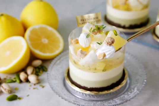 くちどけなめらかなレアチーズとピスタチオムースに、ライムとミントのジュレを重ねて、爽やかな果実をたっぷりとあわせました。ひとくち、またひとくちと食べるごとに、瑞々しい果実の爽やかな酸味とやさしい甘みがじゅわっと口の中に広がります。