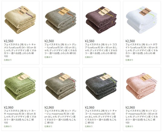 – 税込価格:バスマット 2,750円、フェイスタオル2枚 2,960円など