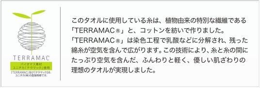 ユニチカ(株)のバイオマス素材「テラマック」を製造時に使用したオリジナル糸を、独自技術により開発しました。このオリジナル糸を使うことで、コットンの良さを最大限に引き出すことが可能に。ふんわりとした肌ざわり、使いやすいボリューム感、高い吸水性を実現しました。
