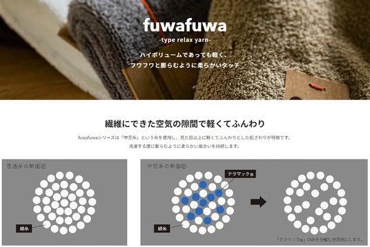 fuwafuwaシリーズは、糸の内側に隙間を作った「中空糸」を使用しています。見た目以上に軽くてふんわりとした肌ざわりが特徴です。