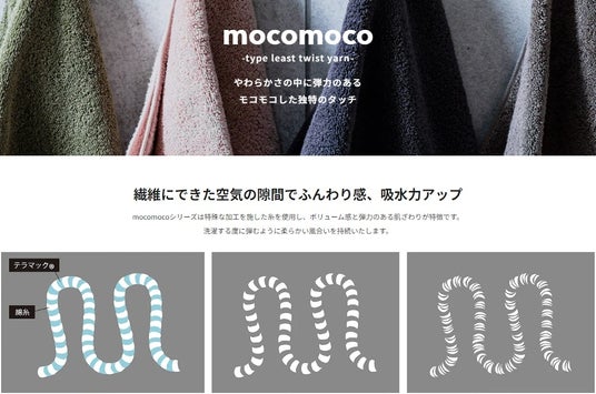 mocomocoシリーズは、ボリューム感と弾力のある肌ざわりが特徴です。繊維にできた空気の隙間で、ふんわり感と吸水力がアップしています。
