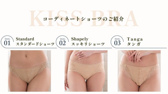 鼠径部にゴムを使用しないやさしい穿き心地で、ヒップをすっぽり包んで美尻に整える「スタンダードショーツ」。ヒップレースで下尻を支え、後ろ中心のギャザーでヒップを立体的に包み込む「スッキリショーツ」。総レースでショーツラインがひびかず、快適な穿き心地の「タンガ」。着用シーンに合わせて選べる3タイプ(※)とコーディネートできます。