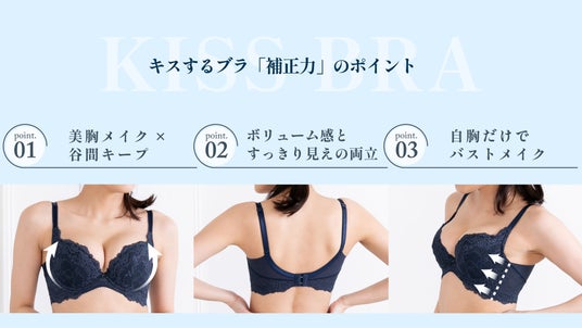 そんな悩みを解決して、憧れのふっくらバストを作るのが、ボリューム感とすっきり見えを両立する「キスするブラ」。育乳ブラのオーソリティであるグラモアが生み出した育乳ブラで、思わずキスしたくなるほどうっとりする、ふっくら丸みのあるシルエットを作ります。デコルテのボリュームをアップするだけでなく、背中のすっきり仕様や高さのあるトップ位置を作る設計で、大人の身体をキレイに見せてくれて、洋服を着た時のシルエットも決まります。