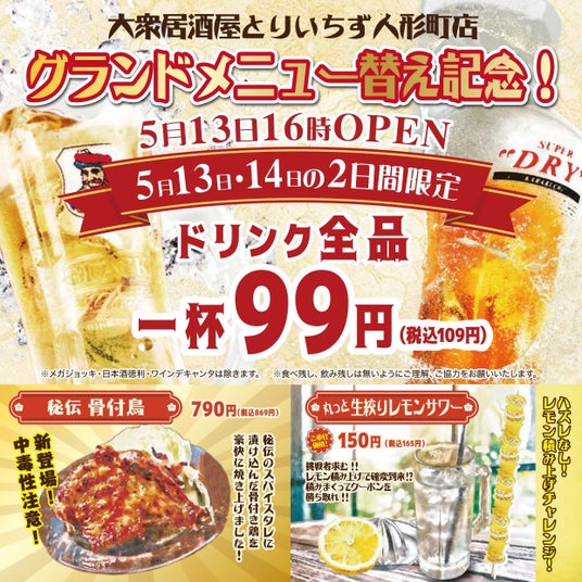 リニューアルオープン&グランドメニュー替えを記念して5月13日(月)、14日(火)の2日間限定!ドリンク全品99円(税込109円)セール開催決定!新しく生まれ変わったとりいちずをお得に楽しめる2日間♪