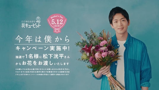本キャンペーンは、花キューピットで母の日のお花を購入しご応募いただいた方のうち1名様に「松下洸平さんからお花をお渡し」のほか、松下洸平さんサイン入り花キューピットの母の日ポスターやオリジナルポストカードをプレゼントする企画です。