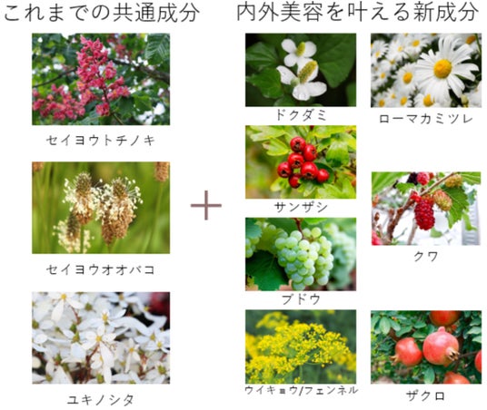内外美容にも着目した「エイジーセオリー」は、これまでのスキンケア共通成分に加え、「エイジーセオリー AGドリンクX」に使用している植物とリンクした成分を新しく配合。内と外の両側面からアプローチする内外美容を実現しました。