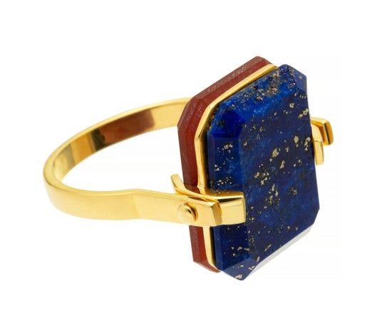 SANDWICHという名前の由来の通り、このリングはスライスしたパンに見立てた2種類の天然石で9Kゴールドのパーツをサンドした独創的なデザイン、気分やスタイルに合わせてお好きな石を楽しんでいただけるように回転してリバーシブルでお使いいただけます。