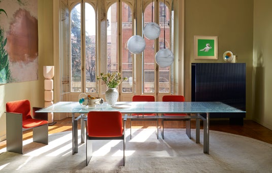 ガラスのエレガントさは、天板の面取りによってさらに強調されます。天板の周囲に施されたこの加工は、輪郭を薄くして透明なクリスタルのフレームを形作り、テーブルの中央部分とのコントラストを生み出す洗練されたディテールとなっています。HAYAMA designed by Patricia Urquiola