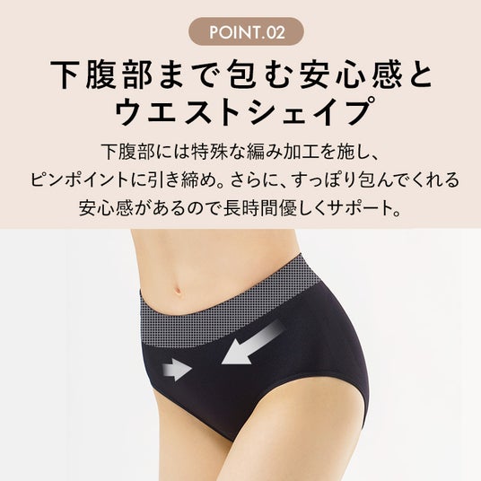 特殊な編み加工で下腹部部分を優しくサポートし、程良い引き締め感で安心できる着心地を実現。長時間着用でも気にならない。
