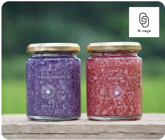 京都・福知山を中心とした農家が作る野菜やお米を販売するWEBショップからは、福知山で丁寧に育てられた玉ねぎのピクルスソースが登場。紫の方はハーブのバタフライピーで色付けし、味はピクルス好きにうれしい“SOUR”。赤い方はハーブのハイビスカスローゼルで色を付け、酸味を抑えた味わいの “SWEET”。細かく刻んだ玉ねぎは、様ざまな調味料と合わせてアレンジするのもおすすめです。