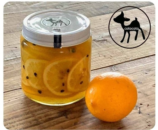 専業農家に嫁いだ奥田晶子さんが作るコンフィチュールは、料理に使えるソースや割って楽しむシロッ プ、パンやヨーグルトにかけるタイプなど、種類の多さと素材の組合せがおもしろいものばかり。こちらは、レモンとオレンジの交配種の国産マイヤーレモンを贅沢に3玉もスライスし、国産パッションフルーツと一緒に炊き上げたシロップ。中に入ったスライスレモンとシロップを、水で割ってマイボトルで携帯すれば、いつでもおいしくビタミン補給できちゃいます!