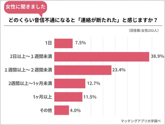 株式会社ネクストレベル(本社所在地:神奈川県横浜市、代表取締役:田中大洋)が運営する『マッチングアプリ大学( https://jsbs2012.jp/ )』は、252人の独身女性に対して、恋人から急に連絡を断たれた経験や取った行動、その後の恋の行方についてアンケートを実施しました。さらに、独身男性128人に対し、急に連絡を断ってしまった時の本音も聞いています。