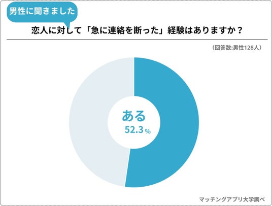 今回、独身男性128人に「恋人に対して急に連絡を断った経験があるかどうか」尋ねてみると、52.3%の男性が「経験あり」と回答しました。