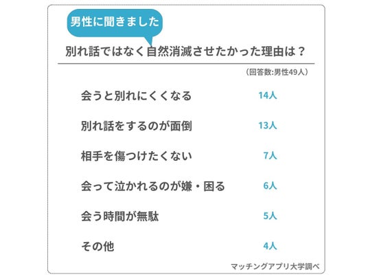 男性からのコメントで特に目立ったのは、連絡を断つことで「自然消滅させたかった」という声。別れ話ではなく、あえて連絡を断つという方法を選択するのにはなにか理由があるのでしょうか。「自然消滅させかった」という男性49人に詳しく聞いてみました。結果は次の通り。