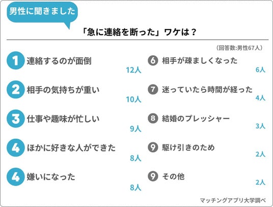 そこで、恋人との連絡を急に断った経験がある男性67人に、連絡を断った理由を聞いてみると次のような結果に。