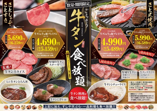国内197店舗を展開する「和食さと」では、人気の食べ放題「さとしゃぶ・さとすき・さと式焼肉」に、なんと「牛タン」が食べ放題の特別コースを期間限定で販売します。