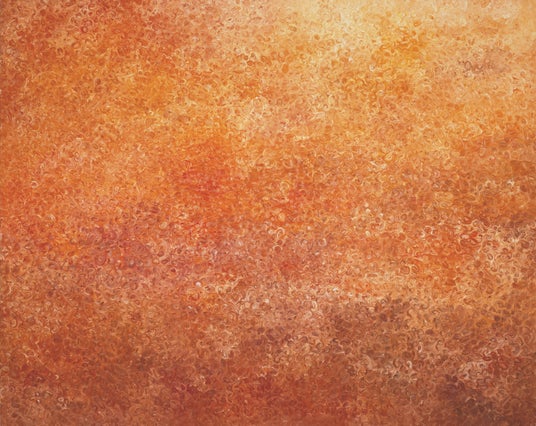 デンマークでニーボーダー地区の古くからある集合住宅とグルントヴィークス教会を訪れた。集合住宅ではその壁のオレンジ色に不思議な感覚を得た。長い間多くの人たちが同じ壁の色を見て、様々な想いを馳せてきたことだろう。私には収穫という感覚が伝わってきた。グルントヴィークス教会では、その白い煉瓦が導く静謐さにより、崇高な感覚を得て心が穏やかになった。こうした私の感覚を、オレンジと白色のヴォルテックスペインティングによって、古の人たちの記憶とシンクロナイズさせてみようと思った。より普遍的な感覚を得るために。