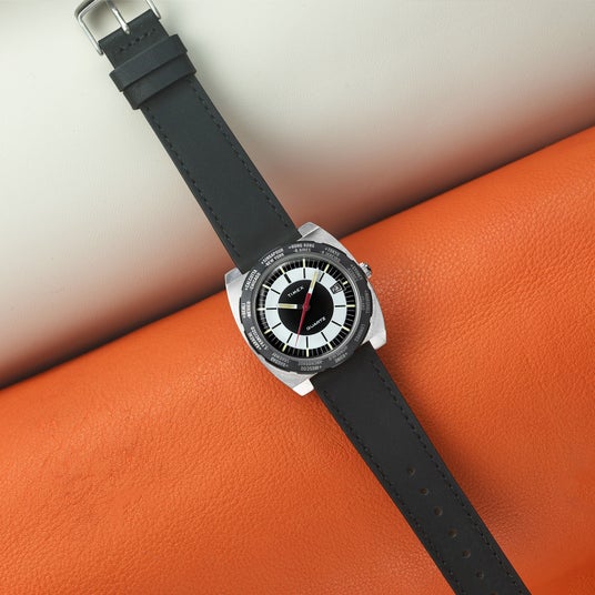 クッションシェイプのケースにモノトーンの文字盤、赤い秒針と蓄光塗料があしらわれた時分針といった意匠はいまも通用する洗練されたデザインで、それでいて出しゃばり過ぎない個性も兼ね備えています。