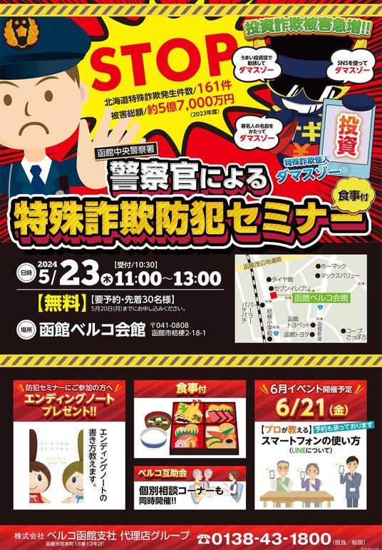 2024年5月23日(木)函館ベルコ会館で「特殊詐欺防犯セミナー」を開催いたします