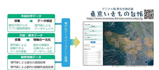 東京に生息する野生生物のいわば“住民台帳”のようなものです。いつどこに、どんな生物が生息していたのかを、誰でもが簡単に専用WEBサイトで検索し、デジタルマップ上に表示することが可能となります。