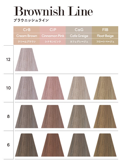 今回発売する“ブラウニッシュライン”は、いつものブラウンにちょっと変化を加え、グレイッシュで透明感のあるベージュ系ブラウンを表現。4色相13アイテムのラインナップで、どの色も複雑なミックスが一切必要なく、1本で絶妙なニュアンスブラウンを表現できます。ハイトーンや中明度のファッションカラーだけではなく、ファーストグレイ世代の白髪ぼかしにも最適で、白髪をカバーしつつ明度を保ちながら多彩なニュアンスを楽しむことが可能です。