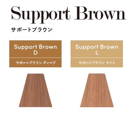 さらに、ハイトーンへのオンカラーやトーンダウン時の色ムラを補正する“サポートブラウン”もラインナップしています。ライト(L)とディープ(D)の2色で、ライト(L)はハイトーンからのオンカラーで色ムラを補正、ディープ(D)はハイトーンからのスーパートーンダウンでムラを補正しながら自然な髪色にするなどヘアカラーのサポートをしてくれるアイテムです。ハイトーンブームの中、今後ますます需要が高まると予想されるアイテムで、サロンに置いておくだけで安心できる“お守り“のようなアイテムになります。