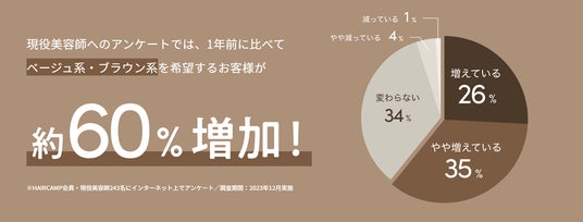 現役美容師へのアンケート調査にて、「ファッションカラーをされるお客様の中でベージュ系やブラウン系のカラーをオーダーする割合」を聞いたところ、「過半数以上のお客様がベージュ系・ブラウン系をオーダーする」と応えたサロンが6割以上という結果が出ました。また、「一年前よりブラウン系やベージュ系を希望するお客様は増えましたか?」という質問でも約60%増加していると実感されています。