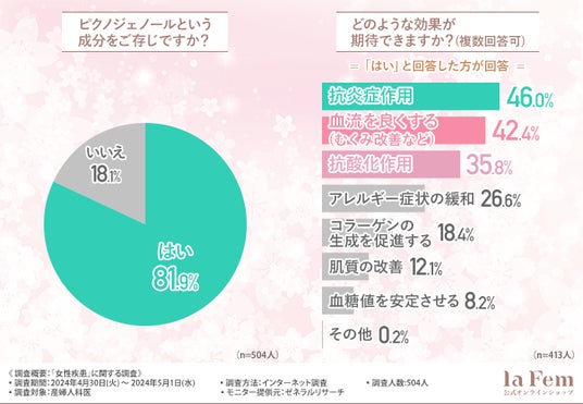 今回、「女性疾患」に関する調査を実施したジャパンローヤルゼリー株式会社は、2023年にフェムケアブランド『la Fem(ラ フェム)』を立ち上げました。女性のライフスタイルが大きく変化するなか、女性のライフステージごとの体の移り変わりに向き合うことが大切となっています。la Fem(ラ フェム)では、女性の「こころとからだ」を優しくケアし快適な毎日をサポートし、素材にこだわったサプリメント『ピクノリズム』(https://www.la-fem.shop/SHOP/LFPR.html)を提供しています。