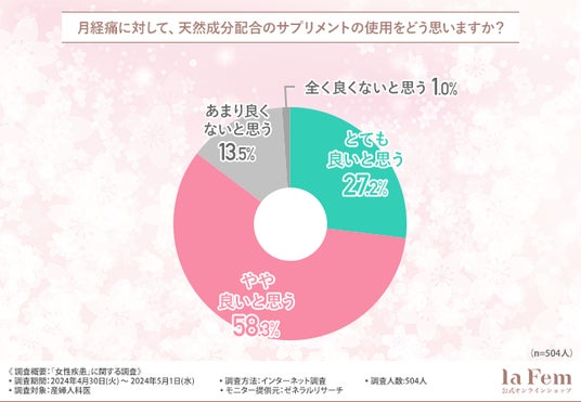「月経痛に対して、天然成分配合のサプリメントの使用をどう思いますか?」と質問したところ、『とても良いと思う(27.2%)』『やや良いと思う(58.3%)』『あまり良くないと思う(13.5%)』『全く良くないと思う(1.0%)』という回答結果になりました。8割以上の方が天然成分配合のサプリメントに対し、ポジティブにとらえていることがうかがえました。