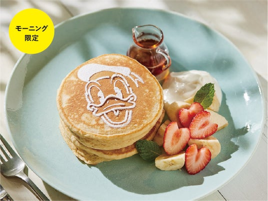 オートミールパンケーキ w/フルーツ&ヨーグルトクリームチーズ ~Donald style~ ¥1,980(税込)オートミール入りのパンケーキは、一面ドナルドダッグのフェイス柄をデザイン。季節のフレッシュフルーツとヨーグルトクリーム、メープルシロップと合わせてお召し上がりください。※10時~11時の限定メニューとなります。